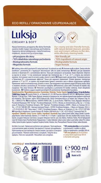 Mydło w płynie Luksja creamy&soft zapas 900ml mleczko bawełniane i prowitamina B5
