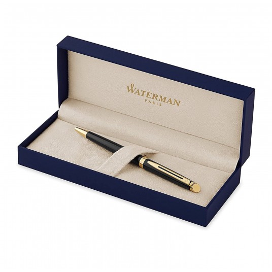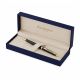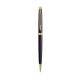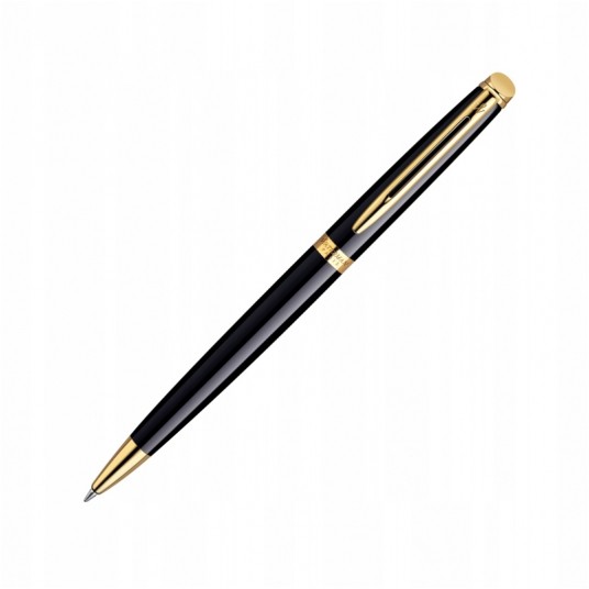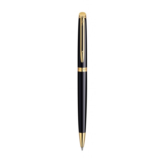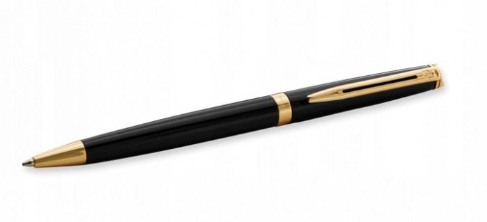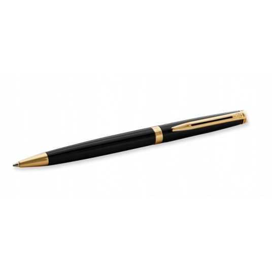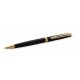 Długopis klasyczny o smukłej, prostej linii. Pokryty czarnym błyszczącym lakierem. Wykończenia platerowane 23-karatowym złotem. Wyposażony w obrotowy mechanizm wysuwania wkładu. Długopis posiada wkład w kolorze niebieskim.