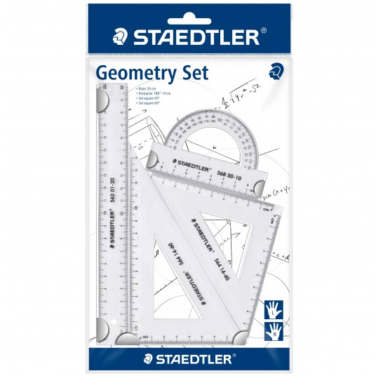 - Zestaw zawiera linijkę 20 cm, ekierkę 60/30° i 45/45°, kątomierz