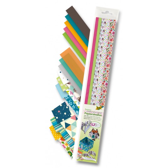 Quilling jest techniką tworzenia ozdób z wąskich pasków papieru, zawiniętych w kształt spężyny i odpowiednio uformowanych. Zestaw zawiera dwustronne kolorowe paski barwione lub przezroczyste w różnych szerokościach: 50 cm x 10mm/15mm/20mm, w zestawie 168 pasków, 6 motywów.