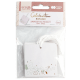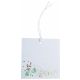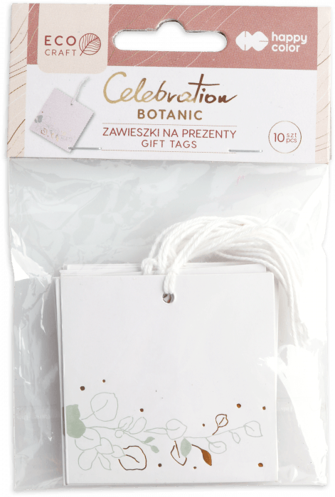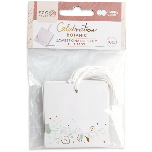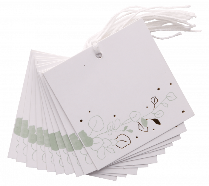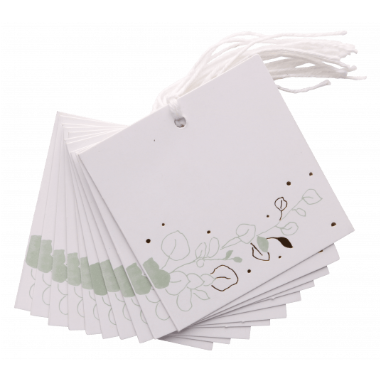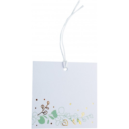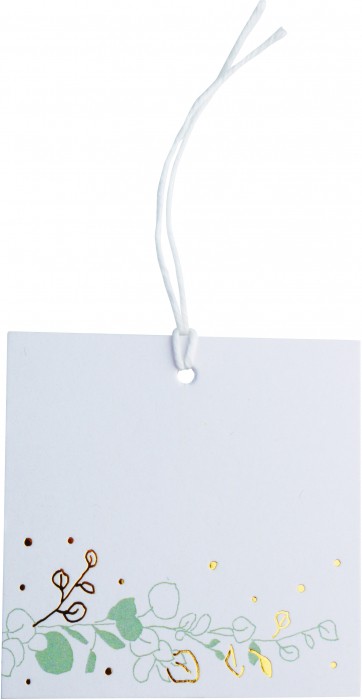Eleganckie kwadratowe zawieszki z białego papieru z nadrukowaną gałązką eukaliptusa i wytłoczonymi złoceniami. Możliwość dopisywania dedykacji. Każda zawieszka posiada sznureczek w kolorze białym. Kształt – kwadratowy. Wymiar – 6 x 6 cm. Sznureczek – biały. Karton – 300 g/m2. Ilość w opak - 10 szt.