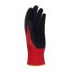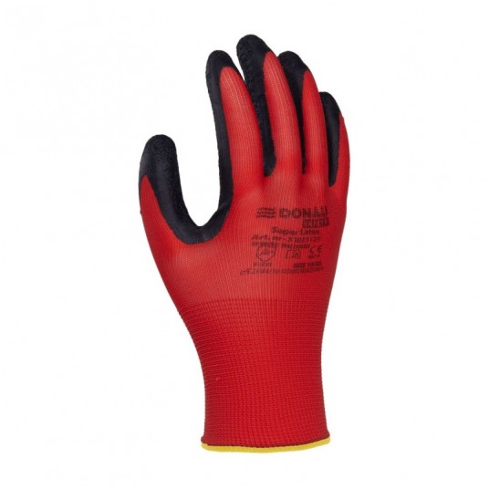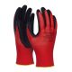 - Rękawice wykonane z dobrej jakości dzianiny poliestrowej w kolorze czerwonym, powleczone w części chwytnej szorstkowanym lateksem w kolorze czarnym