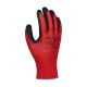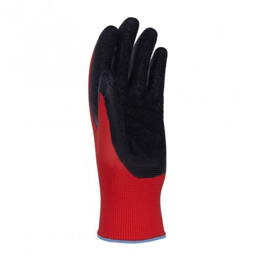 - Rękawice wykonane z dobrej jakości dzianiny poliestrowej w kolorze czerwonym, powleczone w części chwytnej szorstkowanym lateksem w kolorze czarnym