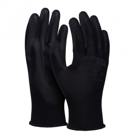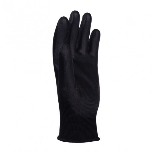 - Rękawice wykonane z dobrej jakości dzianiny poliestrowej w kolorze czarnym, powleczone w części chwytnej czarnym poliuretanem