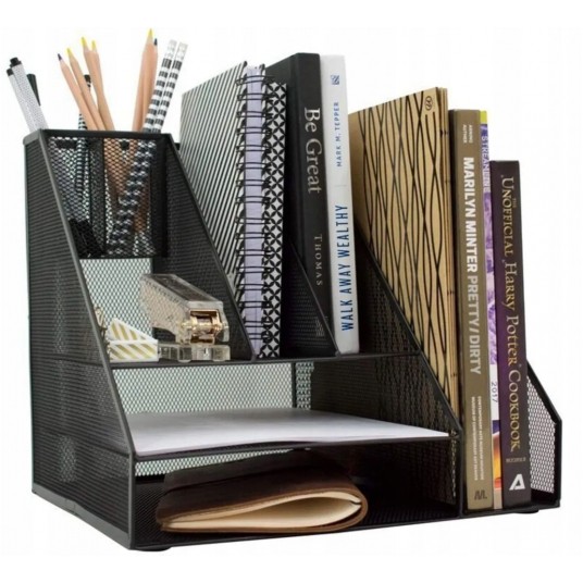 - 8 przegródek : 2 pionowe przegródki na artykuły piszące, 2 pionowe przegródki na korespondencje, 2 poziome przegródki na dokumenty A4, 1 pionowa przegródka o szerokość 11,5 cm na katalogi i segregator, 1 przegródka na karteczki lub inne artykuły biurowe np. zszywacz, dziurkacz