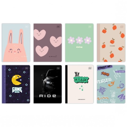 - Format: A5, ilość kartek: 16, 32, 60, 80 (krata, linie, gładki), 96 (krata, linie) oraz 16 (krata - kolor, linie - kolor)