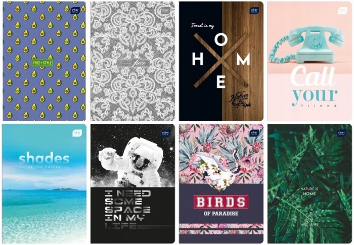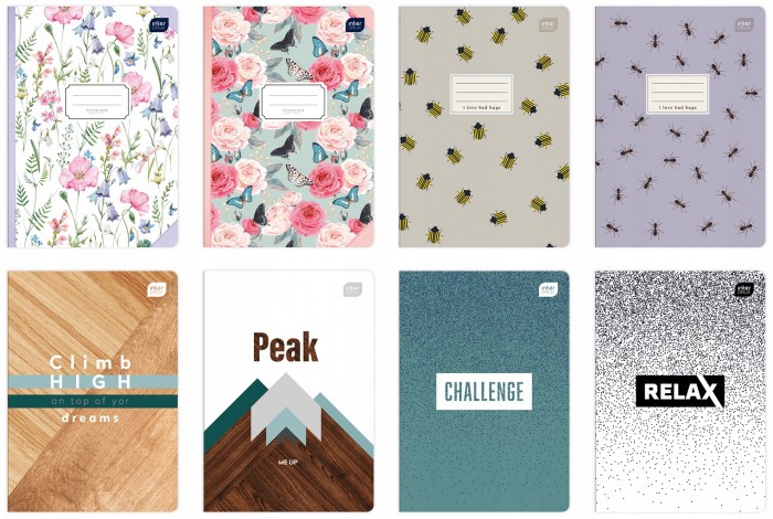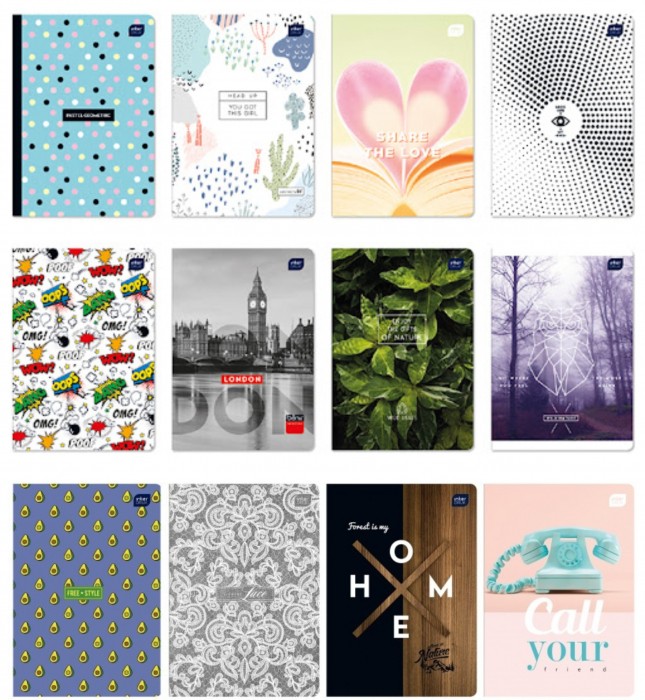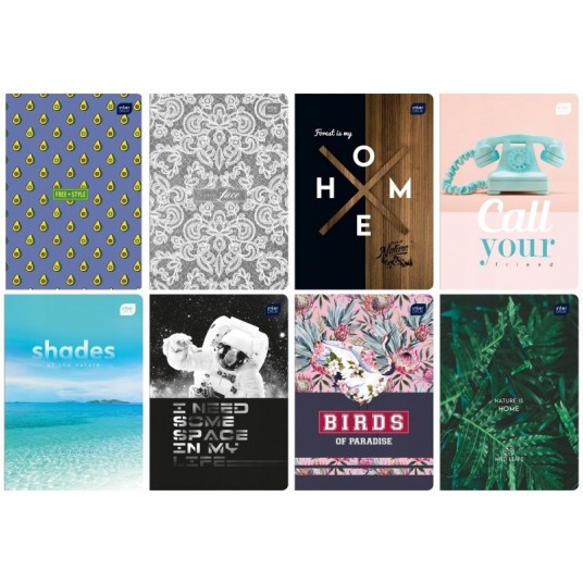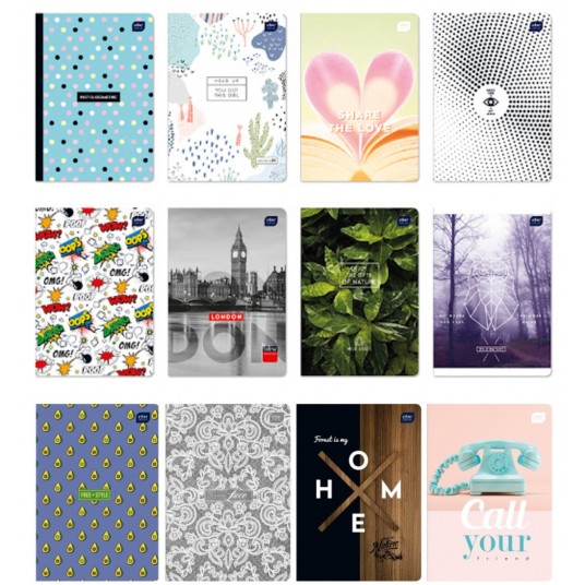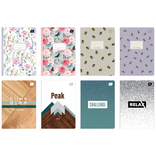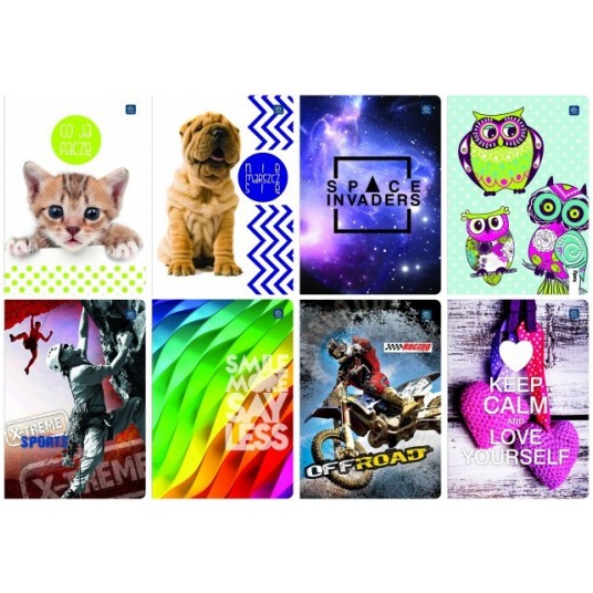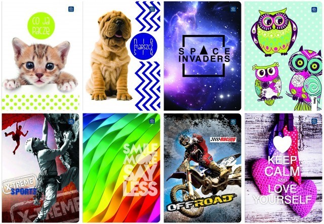 - Format: A5, ilość kartek: 16, 32, 60, 80 (krata, linie, gładki), 96 (krata, linie) oraz 16 (krata - kolor, linie - kolor)
