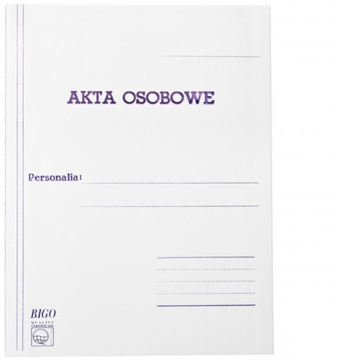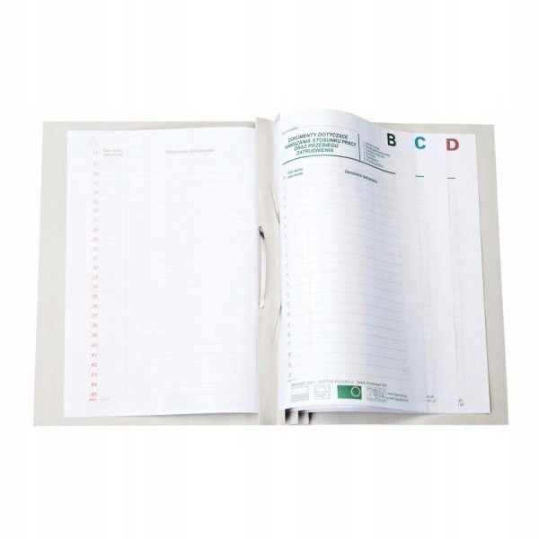 - Dwustronnie zadrukowane przekładki A, B, C, D o gramaturze 90 g/m2 z ekologicznego papieru offsetowego z opisem tematycznie segregowanych dokumentów akt osobowych