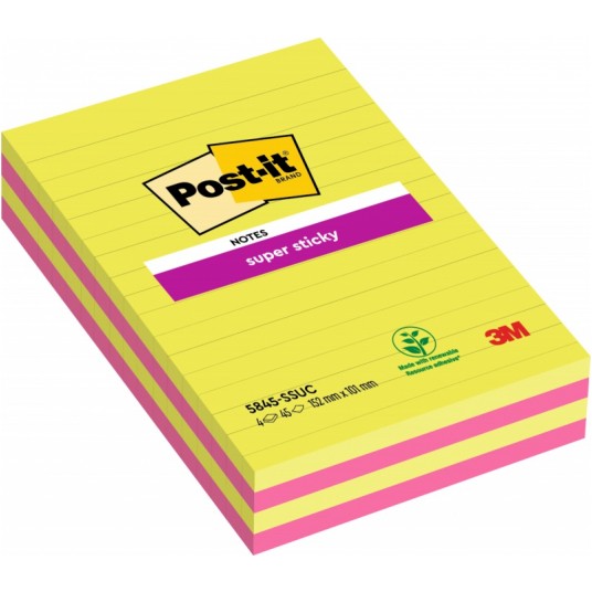 Bloczek samoprzylepny Post-it® super sticky w linie (5845- ssuc), 125x200mm, 4x45 kartek, neonowe