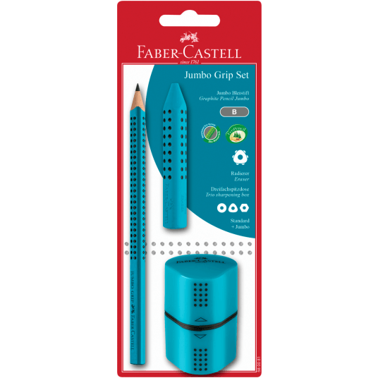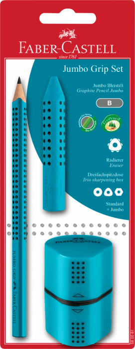 - Zestaw z ołówkiem Jumbo Grip, gumką i temperówką FABER-CASTELL na blistrze.