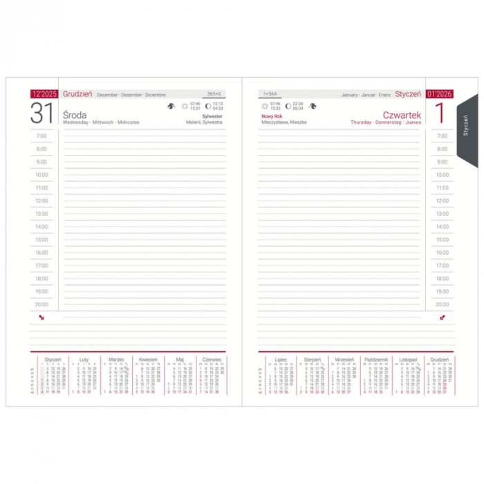 - Terminarz książkowy zawiera m.in.: plan roku, wschody i zachody Słońca, fazy Księżyca, plan urlopowy, wieczny kalendarz, plan każdego miesiąca, informacje dla kierowców, wspólne oświadczenie o zdarzeniu drogowym, zasady pierwszej pomocy przedmedycznej, zasady selektywnej zbiórki odpadów, barwne mapy (PL, EU, świat, kalendarz pyleń, strefy czasowe), kalendarium 2024, 2025 i 2026, alfabetyczny skorowidz teleadresowy