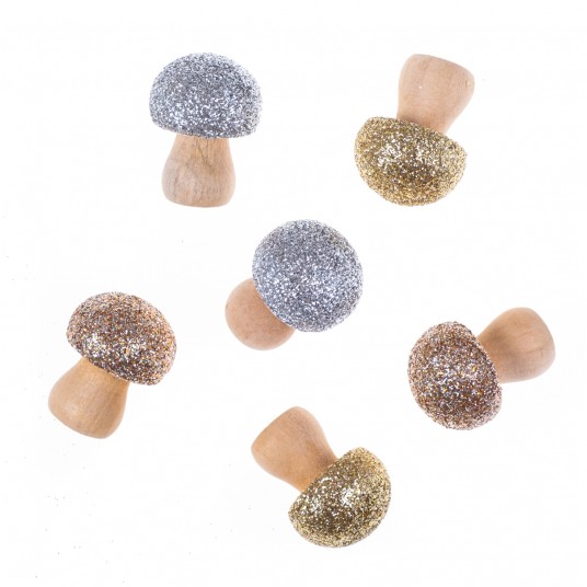 - Drewniane grzybki z kapeluszami pokrytymi brokatem w kolorze srebrnym, złotym i różowego złota to oryginalny dodatek do projektów świątecznych, jesiennych i całorocznych