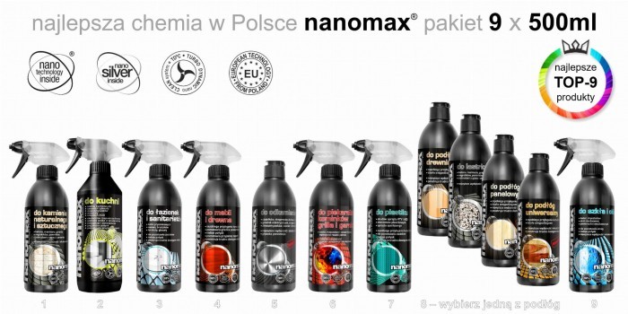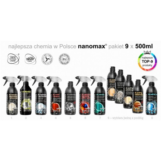 Zestaw TOP-9 Nanomax 1 l płynów do czyszczenia i higieny w twoim domu.