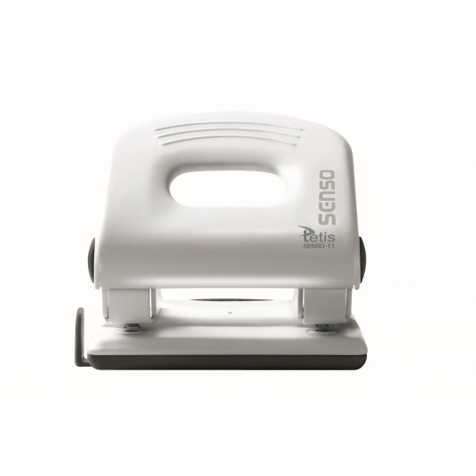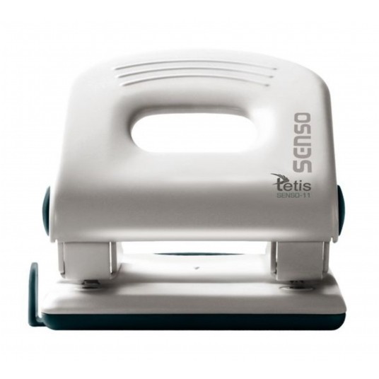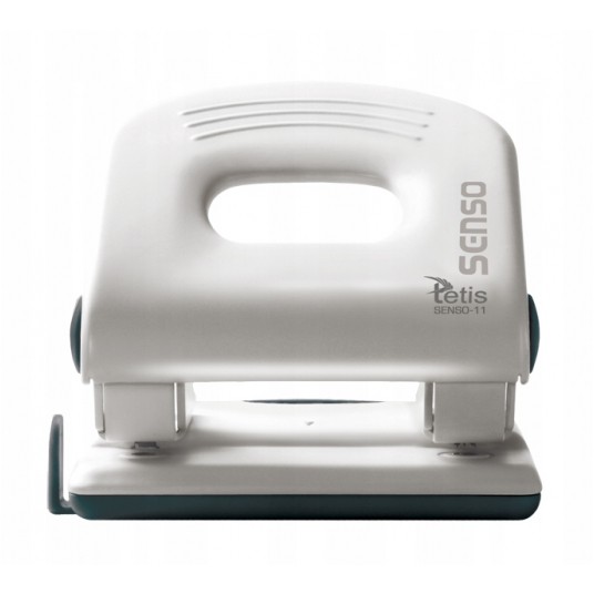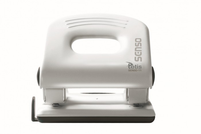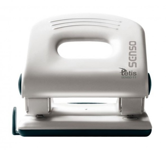 - Metalowy dziurkacz biurowy z wykończeniami z tworzywa sztucznego.
